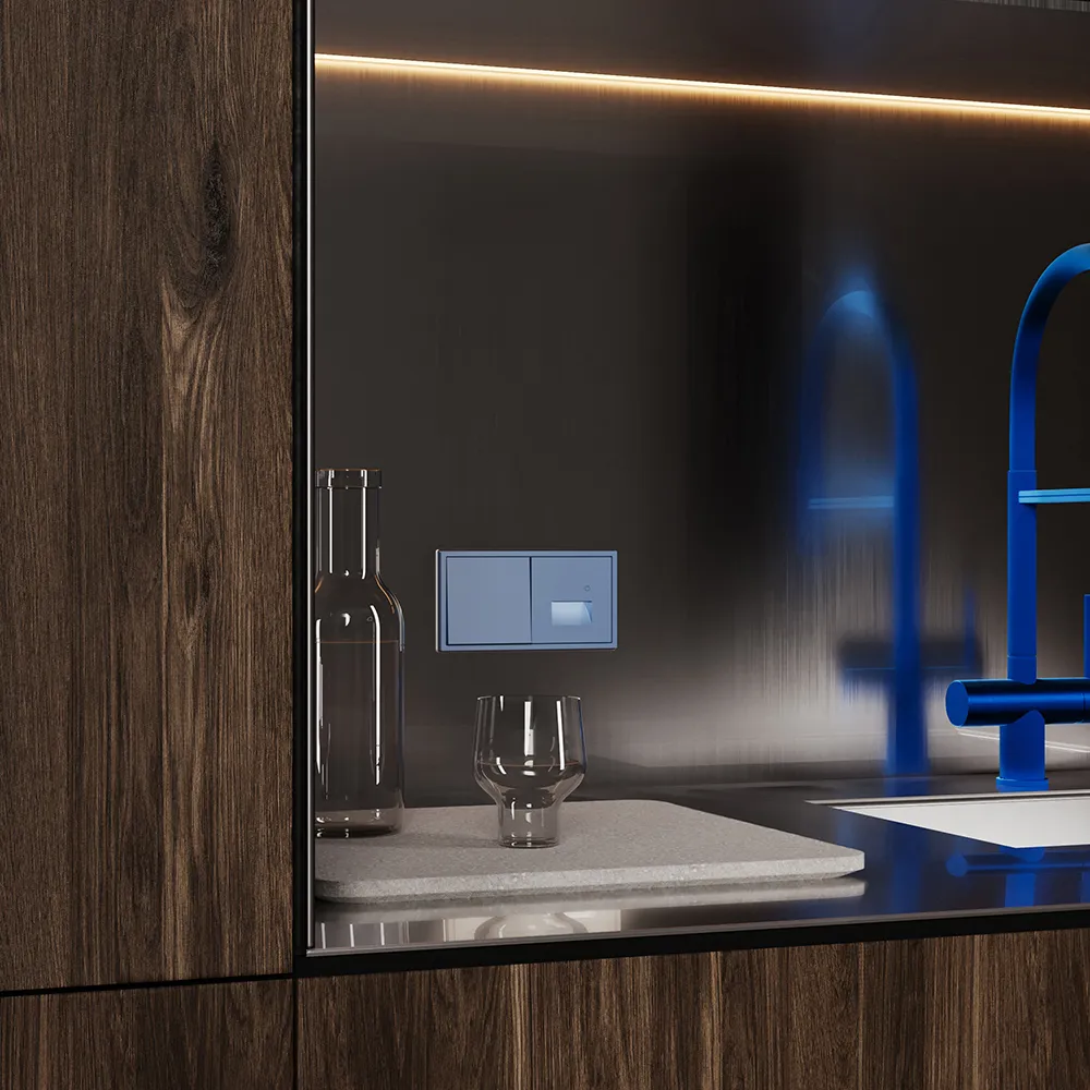Подсветка устанавливается в стандартный подрозетник и совместима со всеми рамками серии S70 — пластиковыми и стеклянными, что позволяет интегрировать её в любую композицию на стене: рядом с выключателем, розеткой или терморегулятором.